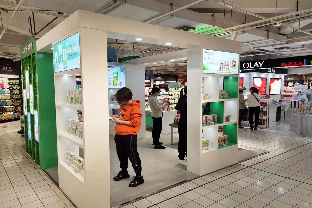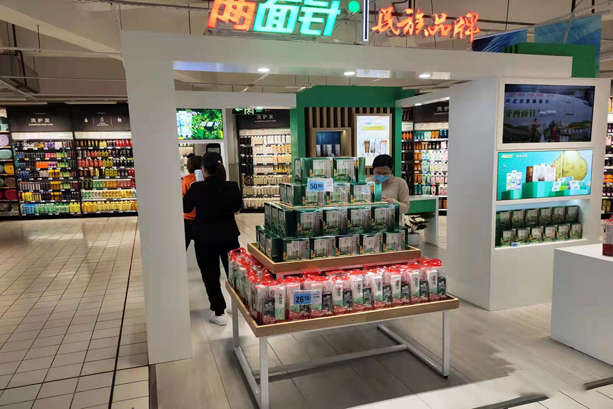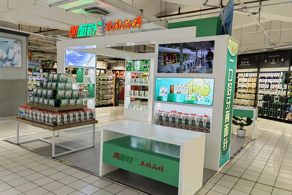兩面針SIS位于大潤(rùn)發(fā)主要銷售通道中,整體設(shè)計(jì)打破了傳統(tǒng)柜臺(tái)銷售理念,秉承“傳承、健康、時(shí)尚”的品牌理念,以2021年東盟博覽會(huì)兩面針展館設(shè)計(jì)為原型,在時(shí)尚的潮流中打造出一片專屬兩面針品牌的藝術(shù)空間,成了整個(gè)大潤(rùn)發(fā)里一道靚麗的風(fēng)景線。開業(yè)當(dāng)天便吸引了眾多消費(fèi)者的圍觀。